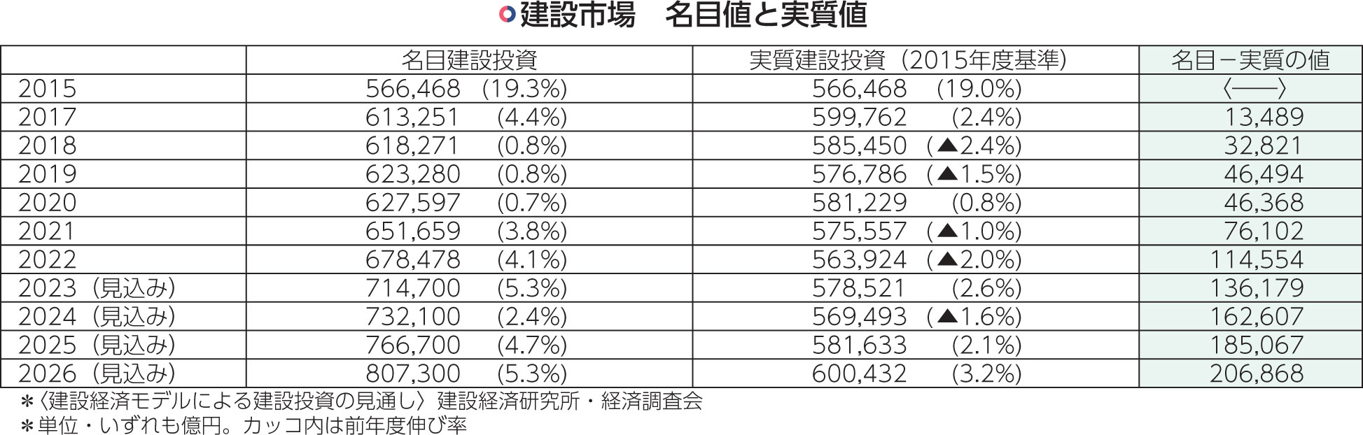 ただし、建設投資の名目額と実質額を比べて見ると、拡大傾向が鮮明の「名目値」に対し、「実質値」は基準年である2015年度の56兆円台から2025年度見通しの58兆円台まで11年間で2兆円程度の増加にとどまっている。ちなみに、「名目値」は同様の11年間で20兆円の伸び。特に近年は、拡大する「名目値」と、伸びの鈍化が顕著な「実質値」の差が拡大。その結果、実体経済で話題の一つとなっている、「名目GDPが拡大しているのに景気回復の実感が乏しい〝名実格差″問題」が、建設投資でも明確になりつつある。