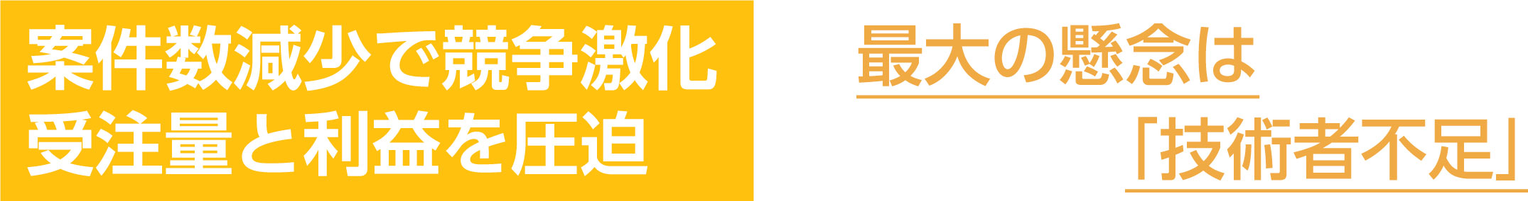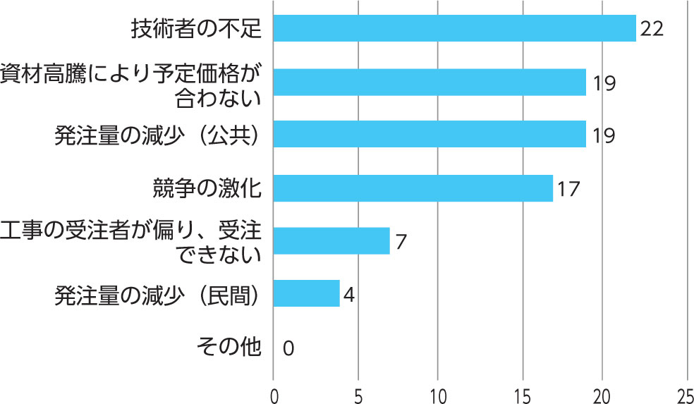 受注状況悪化の理由として、「技術者不足」を挙げる回答数が最も多く、技能労働者不足だけでなく、施工管理を行う元請の技術者の不足が応札・見積り行動に影響を与えている構図が浮き彫りになった。環境悪化の要因では、「資材価格高騰により予定価格が合わない」と「発注量の減少(公共)」が同数2番目となり、「競争の激化」が続いた。