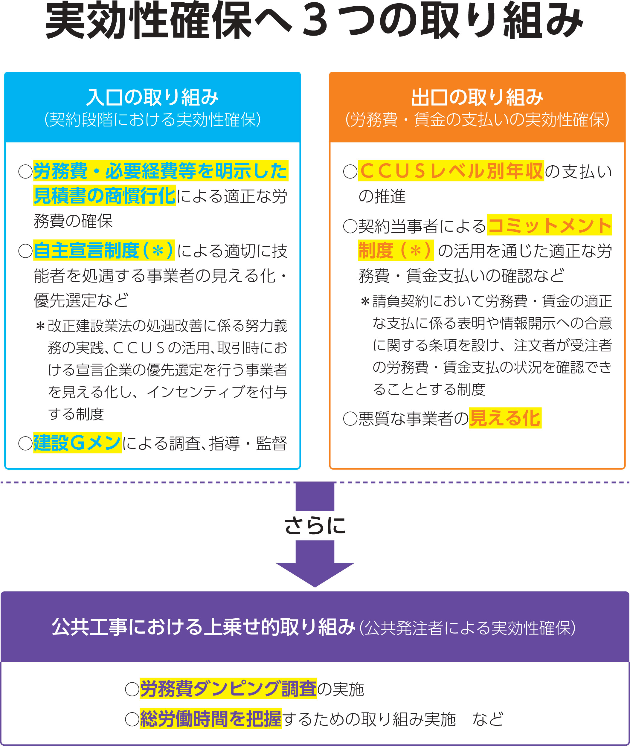 中央建設業審議会が勧告する、「適正な水準の労務費(標準労務費、賃金の原資)」とは、標準労務費の相場観に国が関与するというこれまでにはない新たな取り組みです(図:現状と今後)。そしてこの新たな取り組みの実効性を確保するために、①契約(入口)段階、②労務費・賃金支払い(出口)段階、③公共工事での上乗せ取り組みといった3つの局面で様々な取り組みを設けているのが最大の特徴です(図:実効性確保へ3つの取り組み)。
