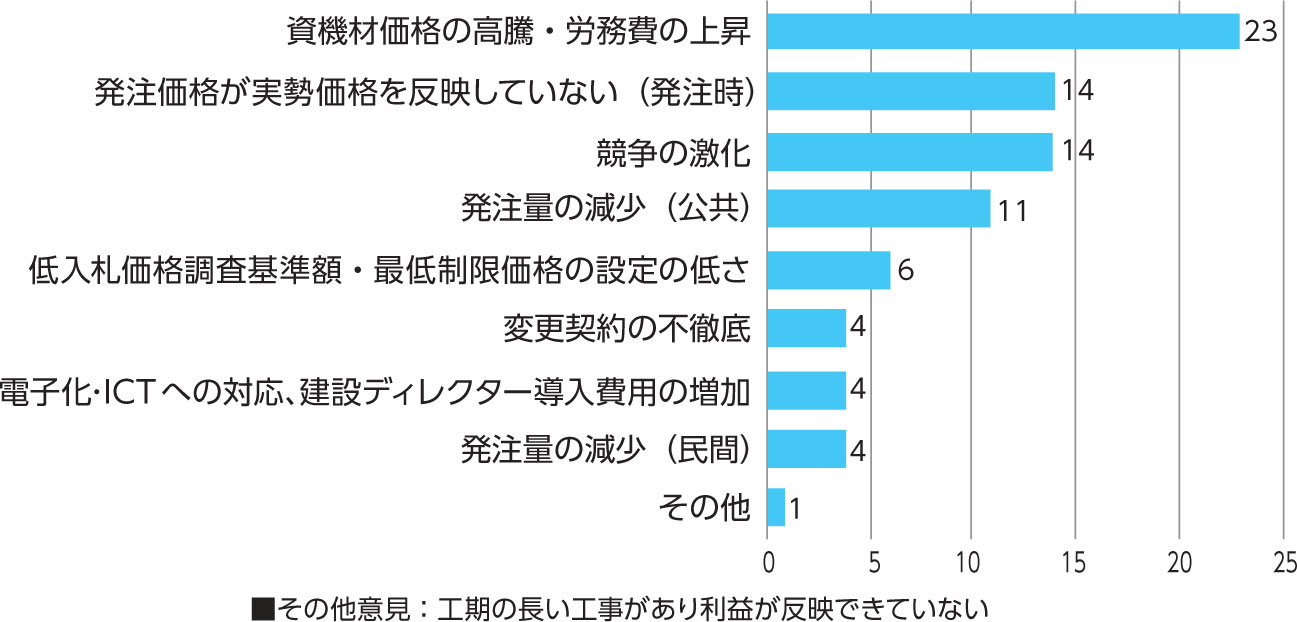 また利益の状況悪化の要因では、「資機材価格の高騰・労務費の上昇」が最も多く、「発注価格が実勢価格を反映していない(発注時)」と「競争の激化」が同数2番目という結果となった。