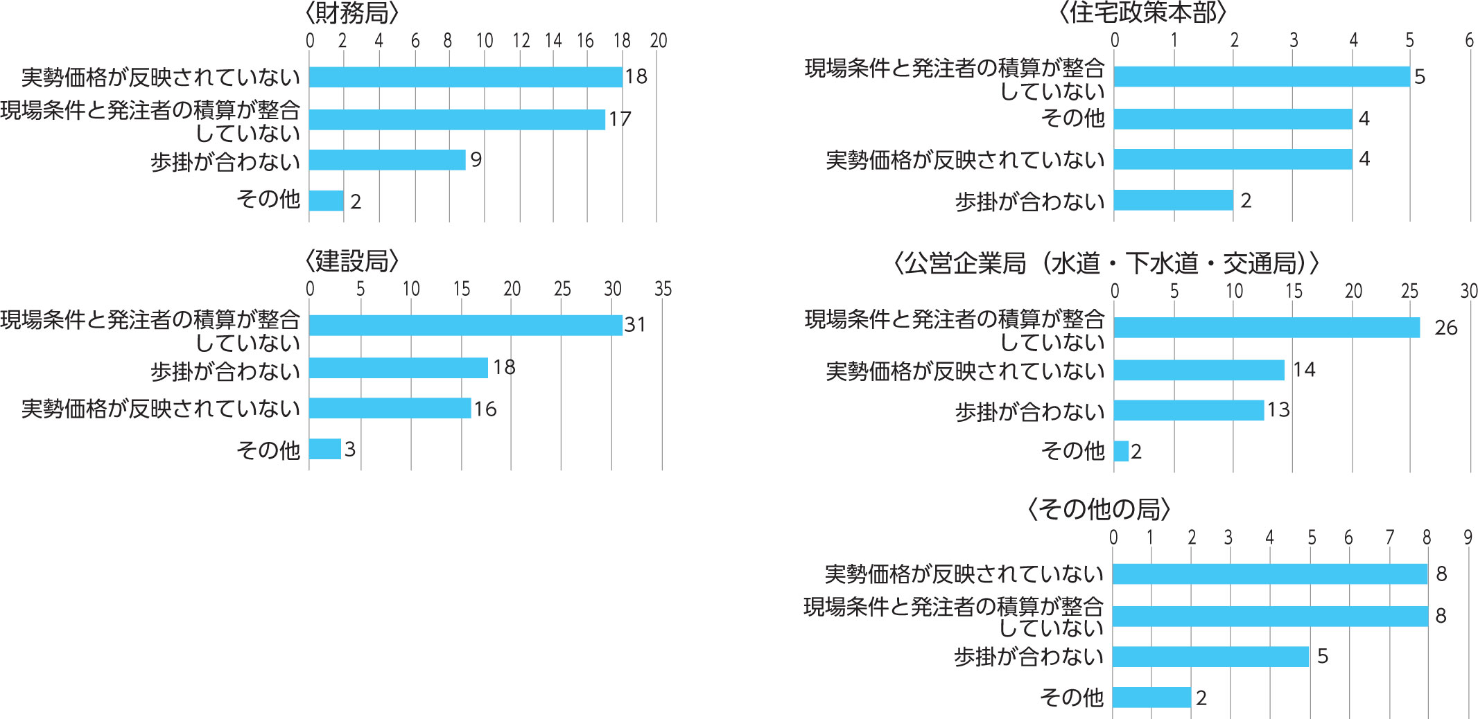 一方、東京都発注工事で各発注部局を対象に、「予定価格には最新の労務単価や資機材の実勢価格が反映されているか」との問いに対して、「概ね適切だが問題がある」「不適切」と回答した理由の内訳を局別にまとめた。共通して「現場条件と発注者の積算が整合していない」との回答が多く、現場条件と積算のかい離指摘が目立った。また、「歩掛が合わない」との指摘も多かった。意見として、「規模や施工条件で通常の歩掛が適当ではないときは、見積りを採用するか、入札額の上限撤廃を検討すべき」との声もあった。