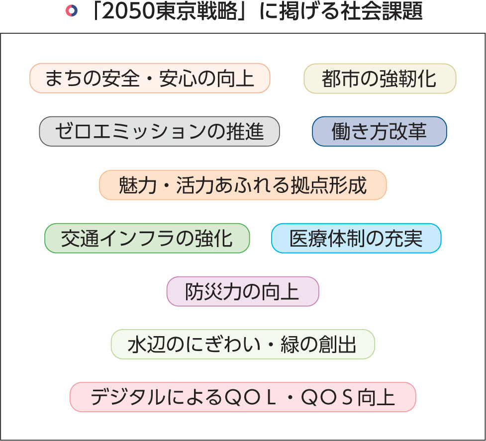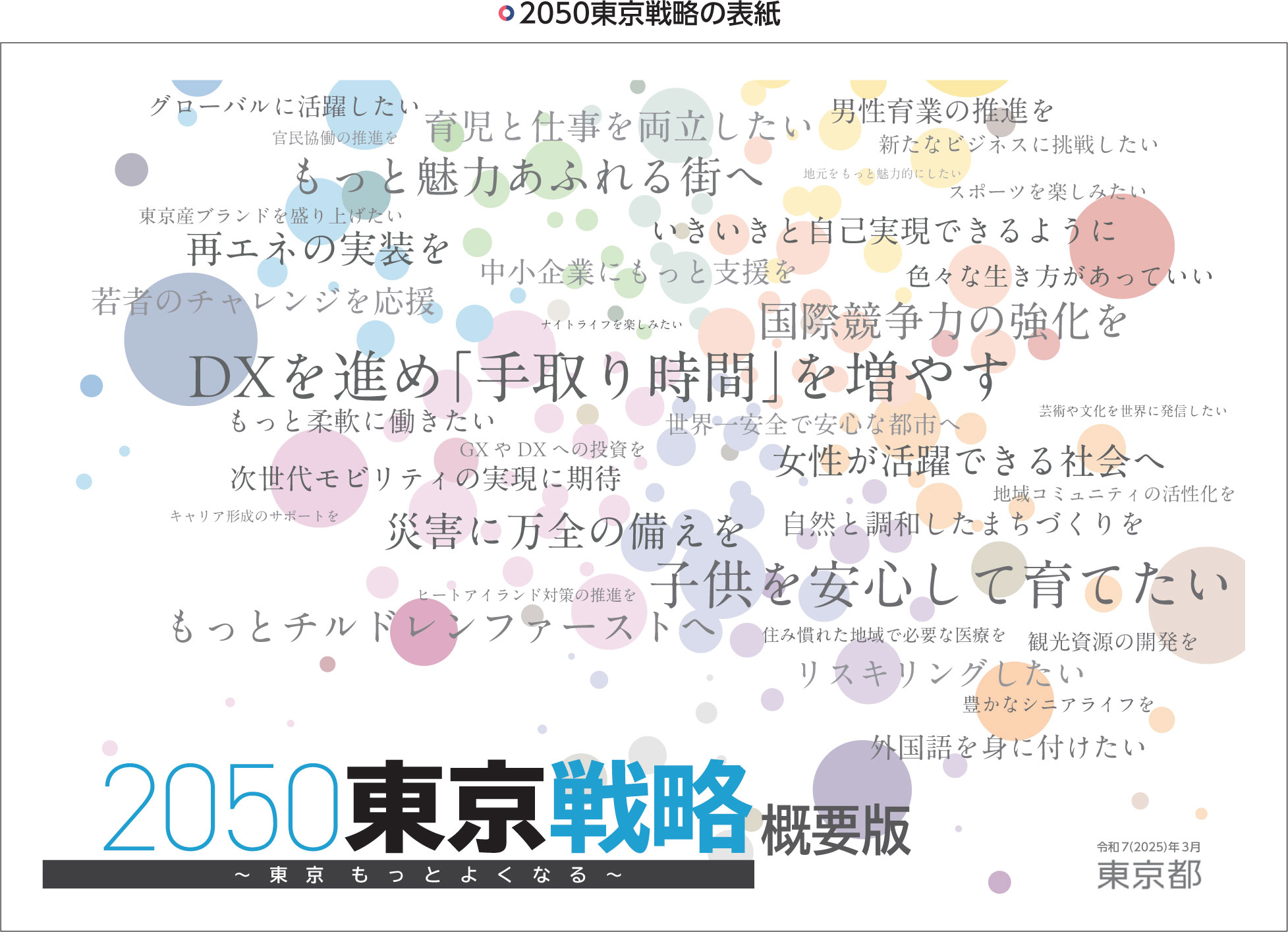 東京都技術会議で加速させるDXやAI活用・実装の成果は、東京都の最上位計画「2050東京戦略」にも反映されることになります。2025年3月に策定された「2050東京戦略」は、現行計画「未来の東京」戦略に代わるものです。人口減少など社会的環境変化を踏まえ2050年代に目指すべきビジョンを設定、その上で2035年に向けた296の政策目標を掲げた、言わば都政運営の新たな羅針盤です。