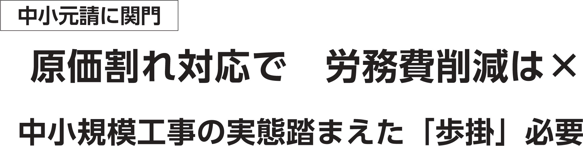 中小元請はこのほかにも厳しい局面が予想されます。一つは官積算で1日の労働時間8時間を前提にしていることです。生産性が大きく低下する夏季や、現場移動が労働時間にカウントされる現場への対応はまだ整っていません。さらに中小企業が受注する小ロット工事に、国交省が定める標準歩掛を対応させると原価割れとなるケースが現実にあることが公共発注者との意見交換で浮き彫りになっています。予定価格時点で原価割れが生じ、かつその予定価格から1割程度を削減し応札することは、収益をさらに悪化させかねません。