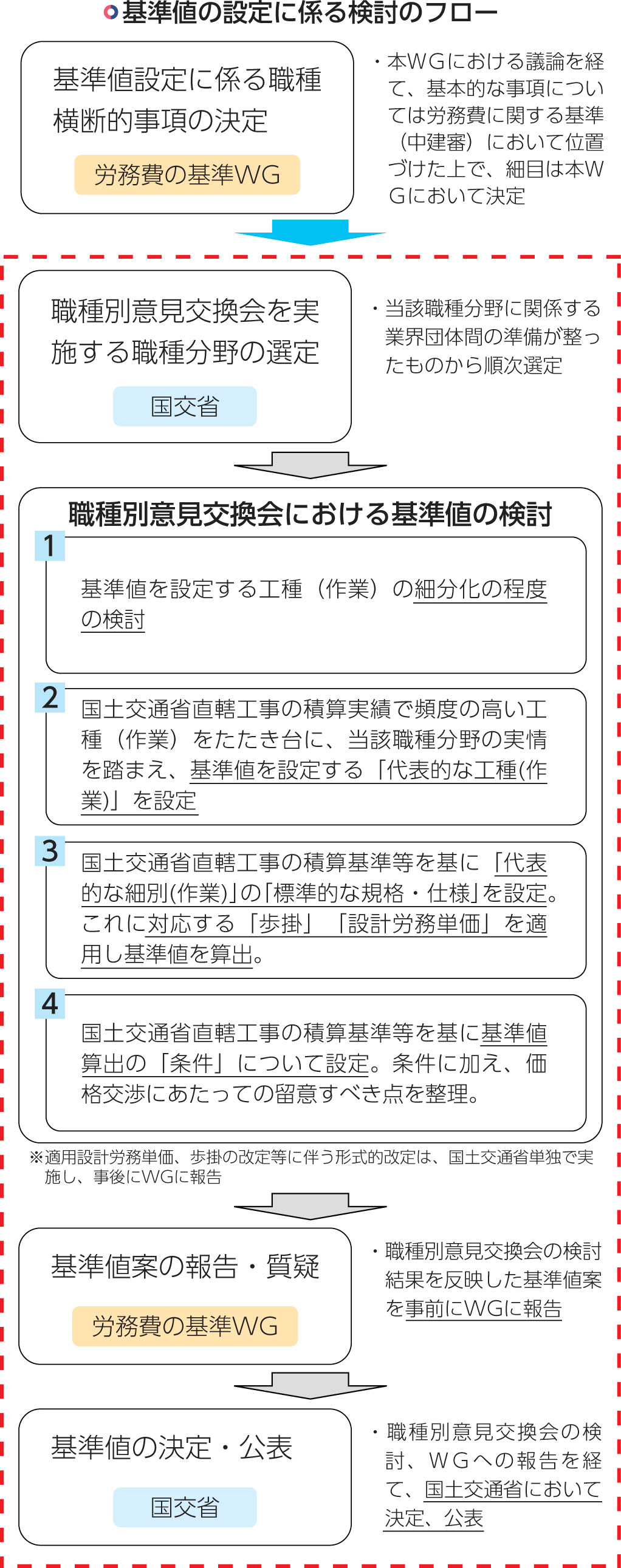 労務費に関する基準(標準労務費)の素案では、一定の職種分野で関係団体と国交省が議論を進めてきた「職種別意見交換会」において検討し算出される、労務費基準の具体値(基準値)を、最終的に国交省が決定・公表する方針であることが明らかになりました。また、職種別意見交換会とは別に、中央建設業審議会下部組織として「労務費の基準に関するワーキンググループ(標準労務費WG)」があります。素案では、この2つの組織の今後の役割分担と、具体的基準値の設定・検討・決定までの流れを明らかにしました。