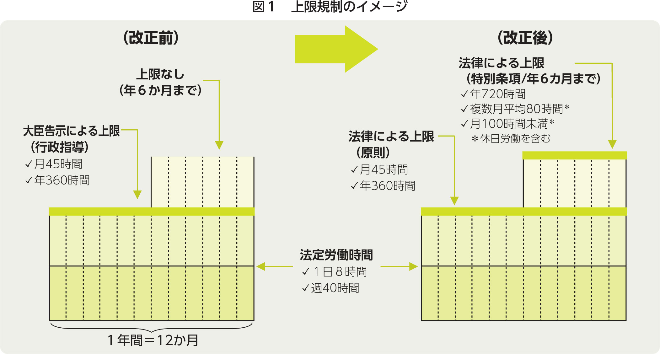 本改正により残業上限時間は図1のようになりましたが、特別条項も含めた上限を常態的に超える労働者というのは、私が把握する限りはそう多くはありません。特に業界の就業者の多数を占め、主として現場作業に従事する技能者は、実際に作業できる時間が限定されるため、昼夜2現場での就業を続けない限りは、上限を超えるような労働時間にはなりにくいはずです。