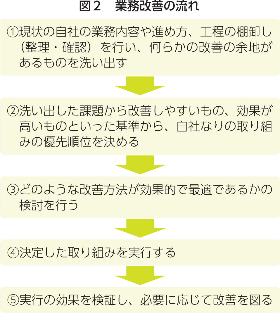 業務改善の大きな流れとしては図2のようなものが一般的ですが、それを進める上では以下に挙げる要素を加味することで、その実行力をさらに増すことができます。